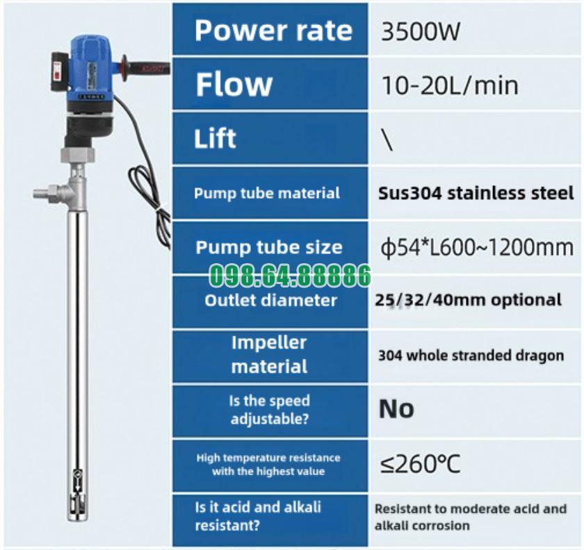 Bơm điện cầm tay dạng trục đứng JDT-3500W-JLG260 sử dụng vật liệu thép không gỉ SUS304 toàn phần