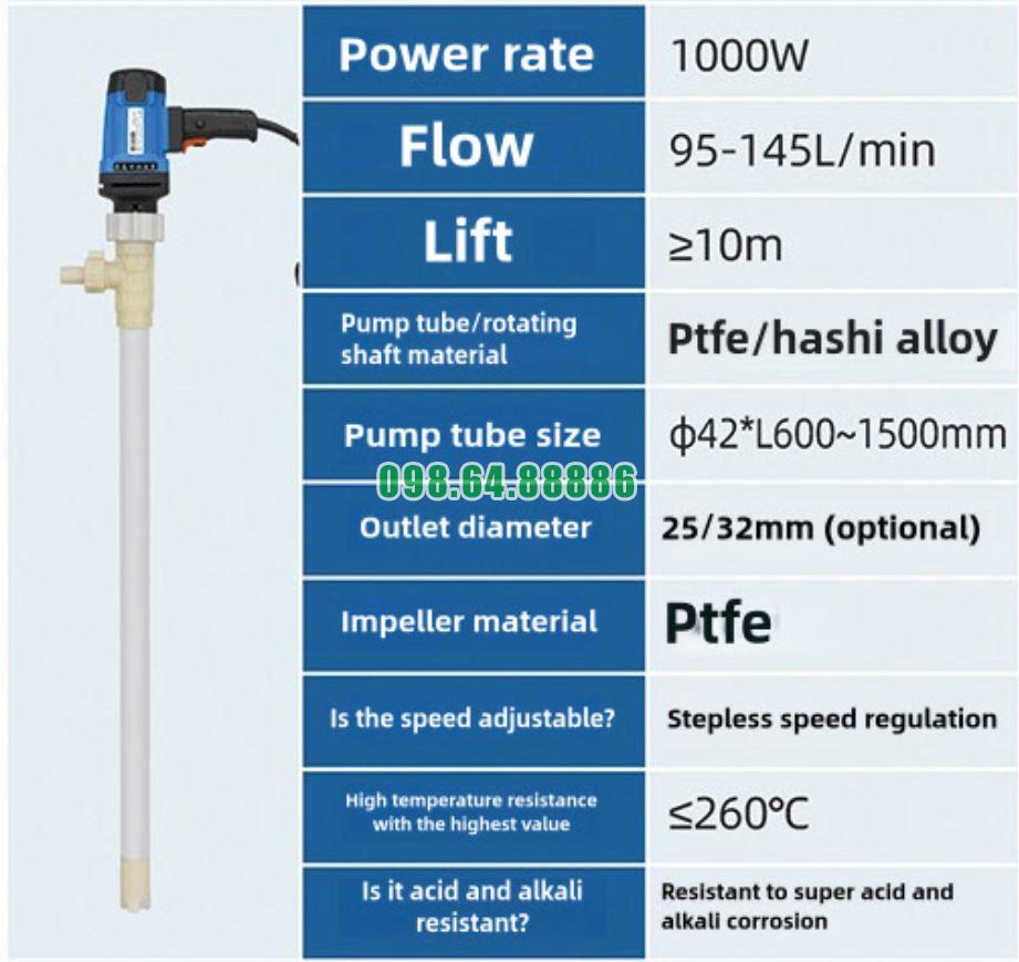 Ngành công nghiệp mạ điện sử dụng nhiều loại dung dịch hóa chất có tính ăn mòn cao như axit, bazơ và dung dịch mạ chuyên dụng. Việc bơm, trung chuyển và cấp hóa chất cho các bể mạ đòi hỏi thiết bị có khả năng chống ăn mòn tốt, vận hành ổn định và đảm bảo an toàn. Bơm điện nhúng thùng phuy hóa chất chống ăn mòn model JDT-1000W-PTFE đáp ứng trực tiếp các yêu cầu này trong môi trường mạ điện.