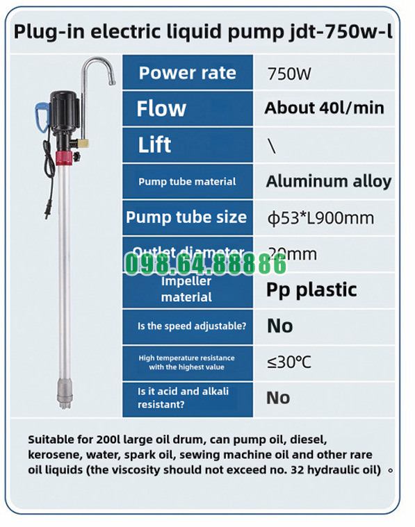 Máy bơm điện hút thùng phuy vỏ nhôm JDT-750W-L sử dụng các vật liệu chất lượng cao cho khớp nối, thường là kim loại chịu lực hoặc nhựa cao cấp, giúp giảm ma sát và tăng độ bền trong suốt quá trình hoạt động. Vật liệu này cũng chống lại sự ăn mòn và không bị ảnh hưởng bởi các chất lỏng bơm qua máy, bao gồm các loại dầu và chất lỏng có tính ăn mòn nhẹ.