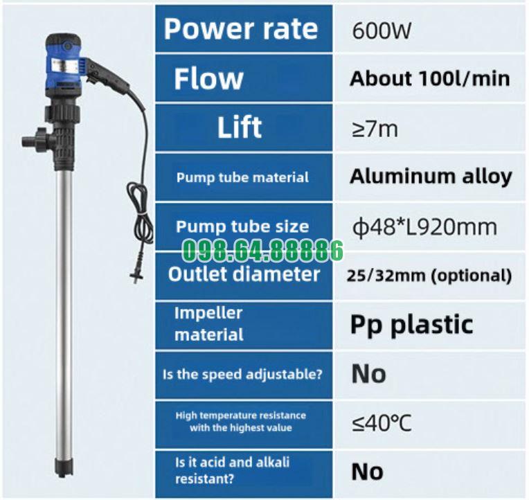 Máy bơm thùng phuy điện JDT-L92-600W thường làm việc với dầu, dung môi hoặc hóa chất, vì vậy cần: