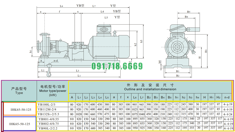 Kích thước lắp đặt của máy bơm nước cánh hở IHK65-50-125 đường thoát đầu vào ra Dn65