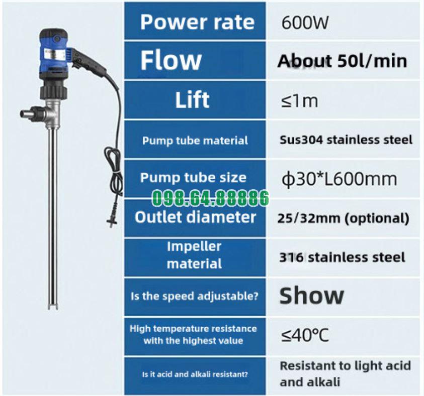 Bơm chiết rót thùng phuy JDT-600W-30SUS304 là thiết bị công nghiệp được thiết kế tối ưu cho hiệu suất cao và độ bền lâu dài. Sản phẩm sở hữu nhiều ưu điểm nổi bật giúp đáp ứng tốt yêu cầu khắt khe trong quá trình chiết rót chất lỏng công nghiệp: