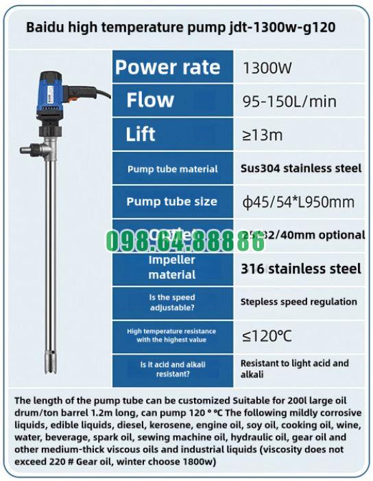 Những yêu cầu này phù hợp với thiết kế chuyên dụng của bơm thùng phuy nhiệt độ cao JDT-1300W-G120.