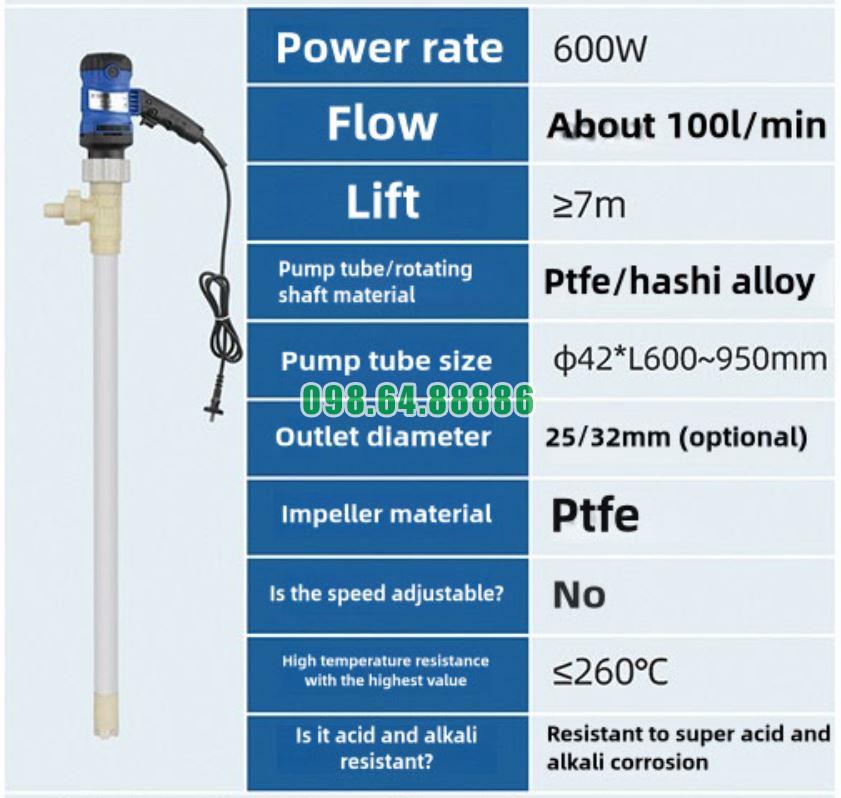 Bơm hóa chất trục đứng JDT-600W-PTFE cho phuy 200L