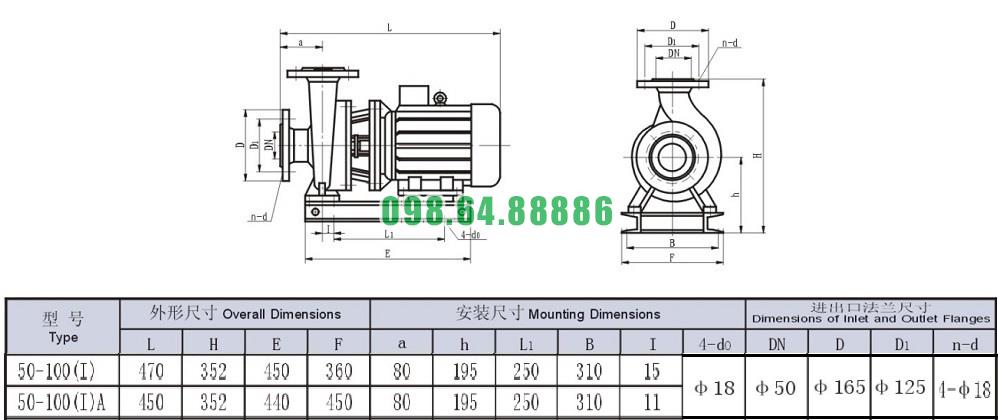 Bản vẽ cấu tạo và kích thước bơm nước nằm ngang SLW-ISW50-100-I công suất 1.5 kw