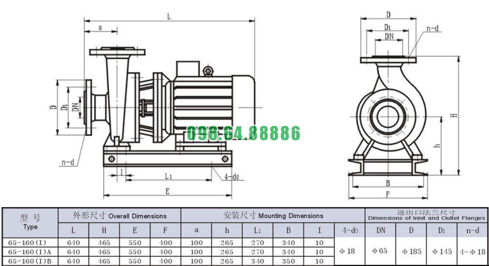 Bảng thông số kỹ thuật bơm nước trục ngang SLW65-ISW65-160-I hút sâu 3m