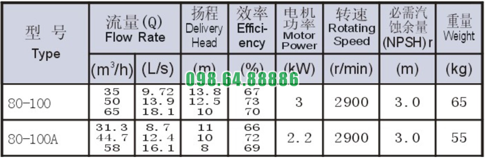 Bảng thông số kỹ thuật bơm nước trục ngang SLW80-ISW80-100 hút sâu 3m