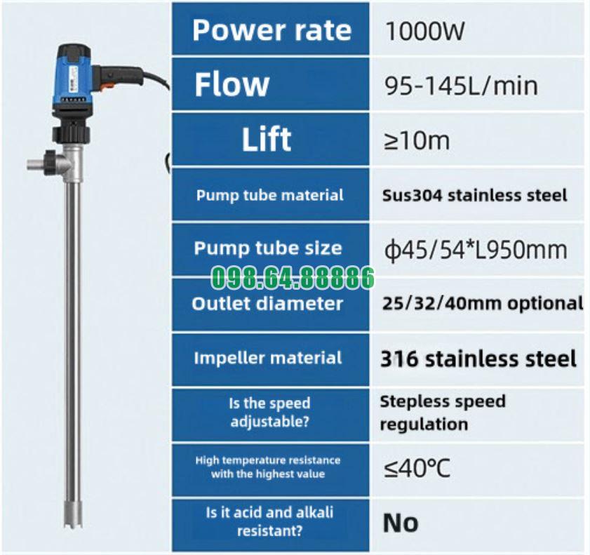Vật liệu inox 304SUS có khả năng chống lại sự ăn mòn của nhiều loại hóa chất có tính axit hoặc bazơ ở mức độ thấp đến trung bình, phù hợp với điều kiện làm việc phổ biến của bơm cắm điện thùng phuy.