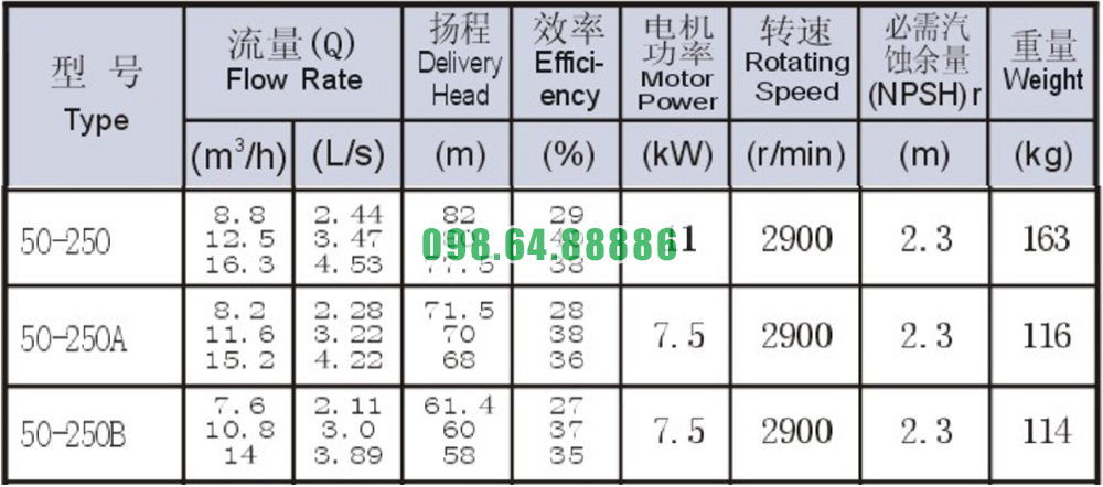 Bảng thông số kỹ thuật bơm nước trục ngang model SLW-ISW50-250 công suất 11 kw đẩy cao 82m