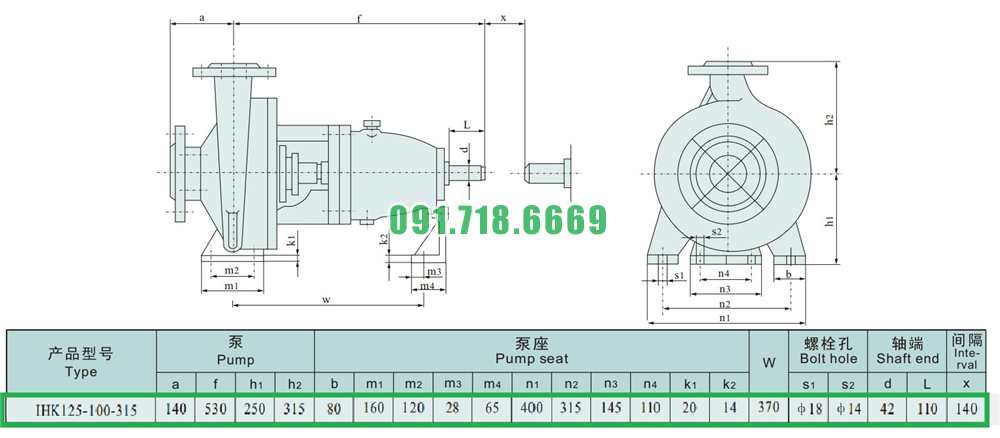 Kích thước của đầu máy bơm cánh hở li tâm trục ngang IHK125-100-315 công suất 110 kw