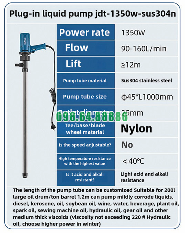 Máy Bơm Hút Thùng Phuy Cắm Điện JDT-1350W-SUS304N Đáp Ứng Tốt Các Tiêu Chuẩn Công Nghiệp Hiện Đại
